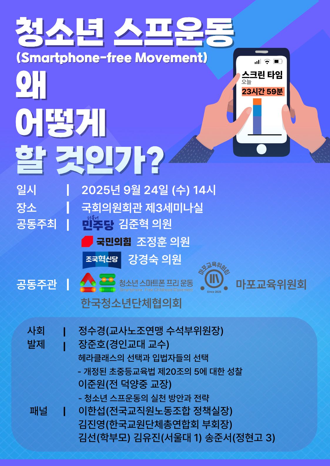 ♠ [청소년 스마트폰 프리운동본부] '청소년 스프운동 왜 어떻게 할 것인가?' 세미나 개최 안내 ♠ 페이지 정보 작성자 관리자 작성일2025.09.15 조회389회 댓글0건 본문 ※ 참석을 희망하시는 분께서는 한국청소년단체협의회(☎ 02-2667-0875)로 문의하여 주시기 바랍니다. 댓글목록 등록된 댓글이 없습니다. 다음글 목록