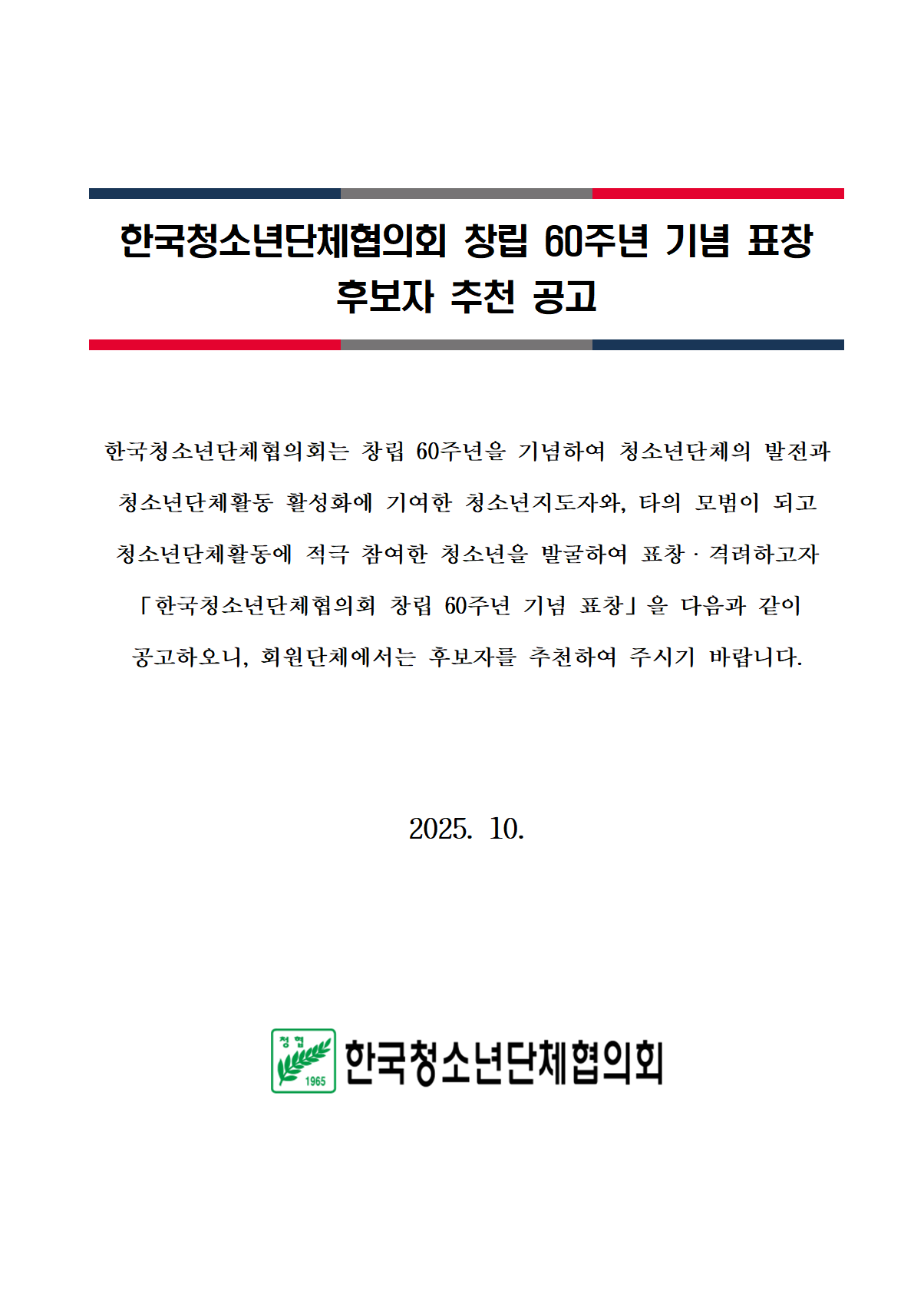 ♠ 한국청소년단체협의회 창립 60주년 기념 표창 후보자 추천 공고 ♠
