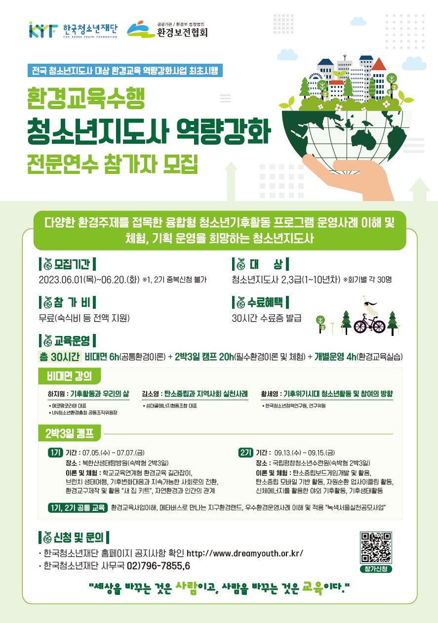[한국청소년재단] 환경교육수행 청소년지도사 부문 역량강화 연수 신청 안내 페이지 정보 작성자 관리자 작성일2023.06.02 조회6,208회 댓글0건 첨부파일 2023년 환경교육수행청소년지도사 역량강화 전문연수 시행계획안.pdf (106.5K) 198회 다운로드 본문 *보다 자세한 사항은 첨부파일을 확인하시기 바랍니다. 댓글목록 등록된 댓글이 없습니다. 이전글 다음글 목록