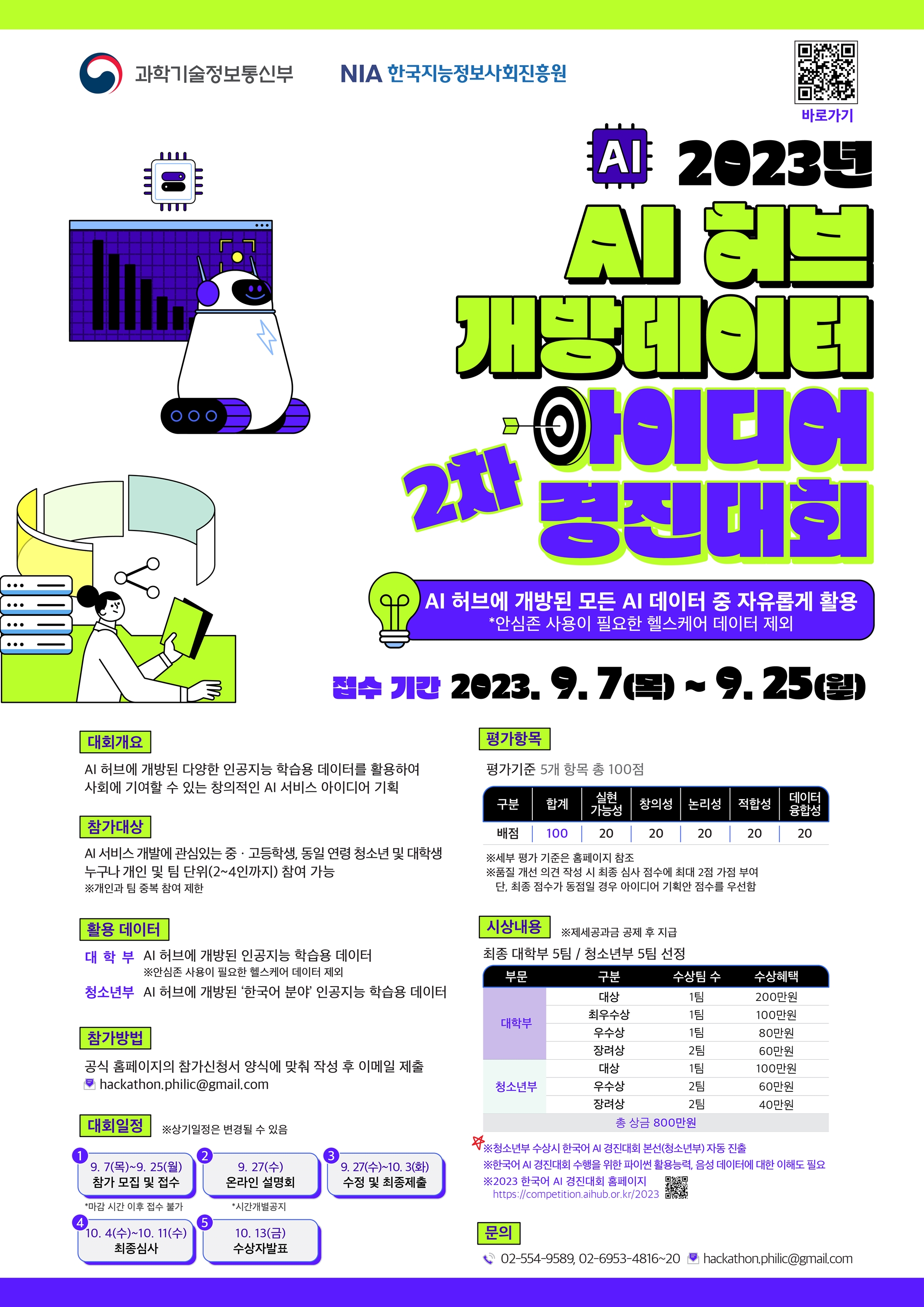 [과학기술정보통신부] `23년 AI 허브 개방 데이터 아이디어 경진대회 페이지 정보 작성자 관리자 작성일2023.09.19 조회2,568회 댓글0건 본문 댓글목록 등록된 댓글이 없습니다. 이전글 다음글 목록