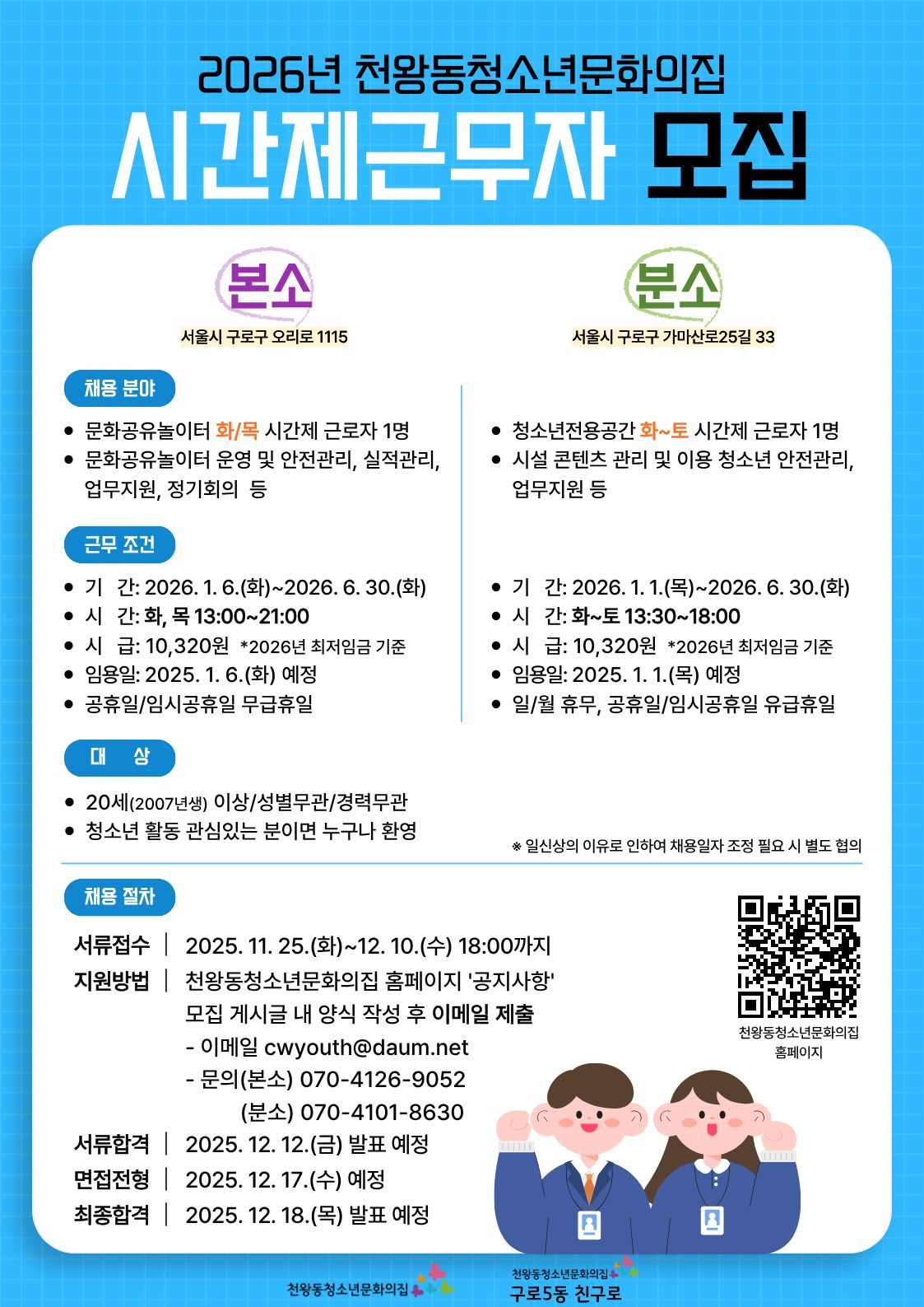 2026년 천왕동청소년문화의집 시간제근무자 채용 공고