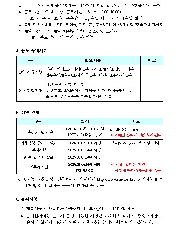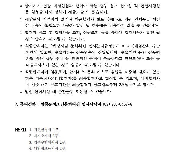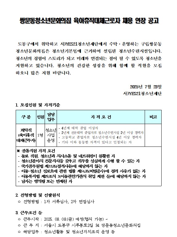 [구인] 쌍문동청소년문화의집 육아휴직대체근로자 채용 연장 공고 페이지 정보 작성자 쌍청문 작성일2025.07.24 조회1,219회 댓글0건 첨부파일 붙임 2025 쌍문동청소년문화의집 육아휴직대체근무자 채용 연장 공고.hwp (26.0K) 82회 다운로드 본문 댓글목록 등록된 댓글이 없습니다. 이전글 다음글 목록