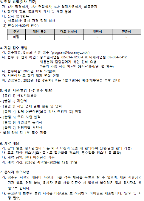 2026년 시립보라매청소년센터 전문 강사 파견 업체 모집 공고 페이지 정보 작성자 보라매 작성일2025.12.02 조회221회 댓글0건 첨부파일 2026년 시립보라매청소년센터 프로그램 전문 강사 파견 업체 모집 공고문청소년사업팀미래사업팀, 채용반환청구서.zip (111.5K) 9회 다운로드 본문 댓글목록 등록된 댓글이 없습니다. 이전글 다음글 목록
