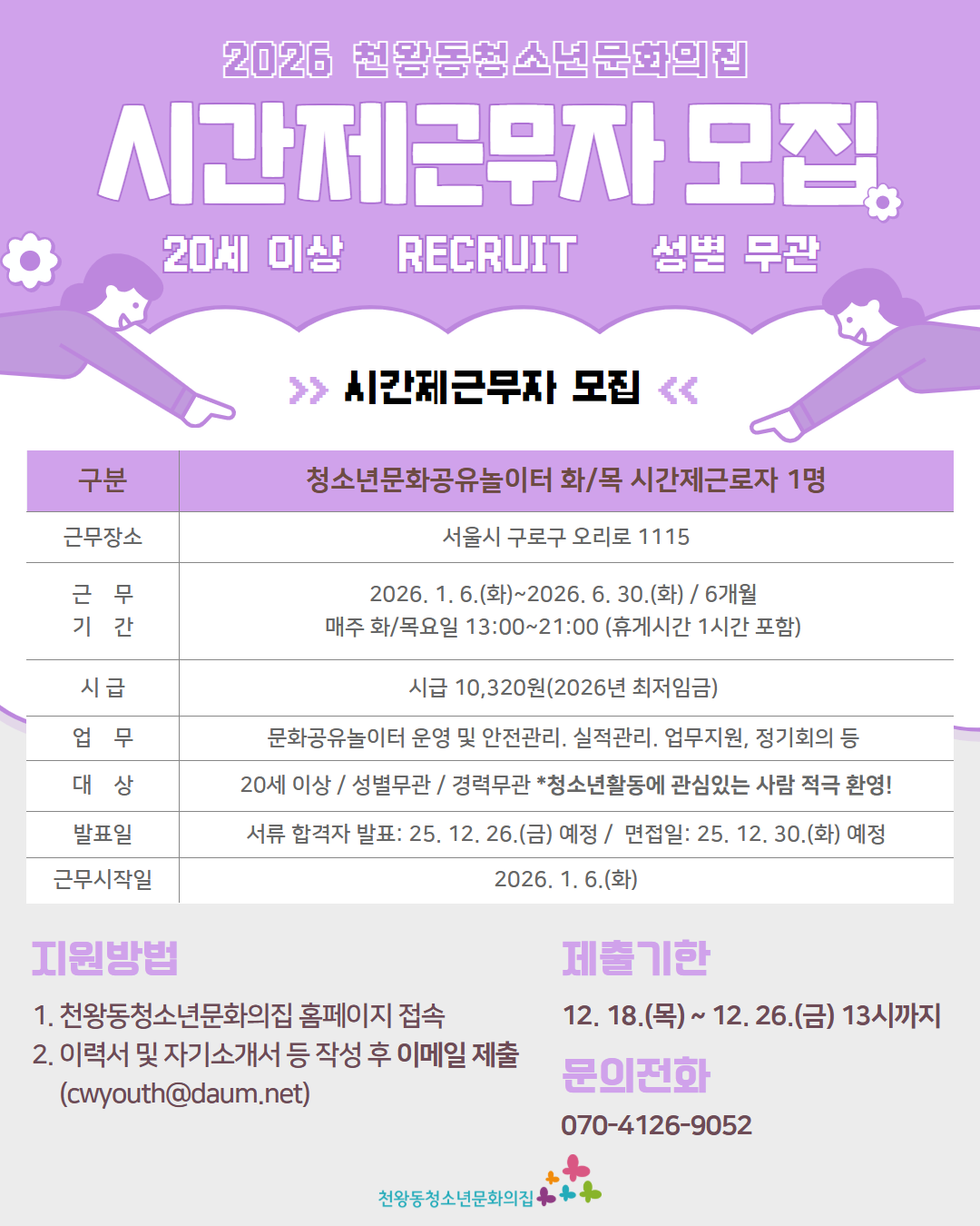 2026년 천왕동청소년문화의집 본소 시간제근무자 채용 공고