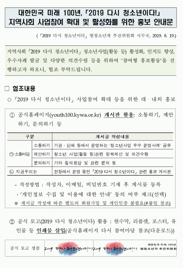 2019다시 청소년이다! 지역사회 사업참여 확대 및 활성화를 위한 홍보 안내