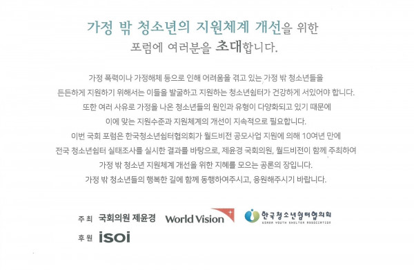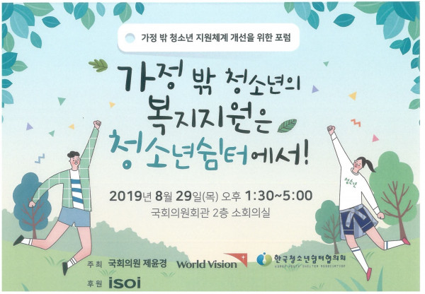 [가정 밖 청소년 지원체계 개선을 위한 포럼] 가정 밖 청소년의 복지지원은 청소년쉼터에서! 페이지 정보 작성자 관리자 작성일2019.08.28 조회19,959회 댓글0건 본문 첨부된 초청창 참조. 끝. 댓글목록 등록된 댓글이 없습니다. 이전글 다음글 목록