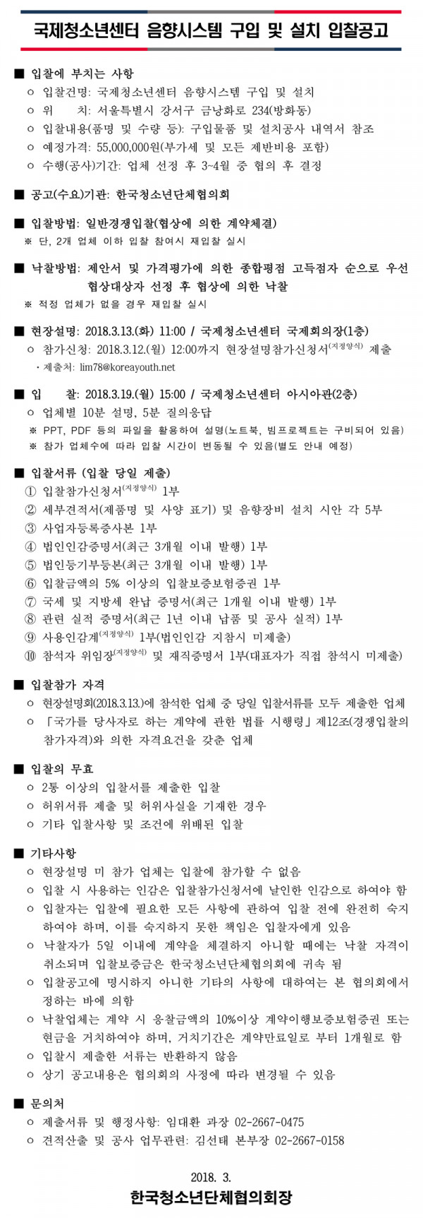 국제청소년센터 음향시스템 구입 및 설치 입찰공고 페이지 정보 작성자 관리자 작성일2018.03.08 조회13,674회 댓글0건 첨부파일 첨부문서.zip (1.1M) 152회 다운로드 본문 ** 자세한 사항은 첨부파일 참조** 댓글목록 등록된 댓글이 없습니다. 이전글 다음글 목록