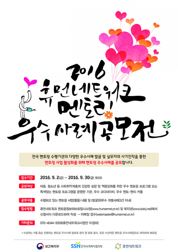1. 한국사회복지협의회 휴먼네트워크에서는 전국 멘토링 수행기관의 다양한 우수사례 발굴 및 실무자의 사기진작을 통한 멘토링 사업의 활성화를 위하여 "2016 휴먼네트워크 멘토링 우수사례공모전"을 추진하고자 합니다.
