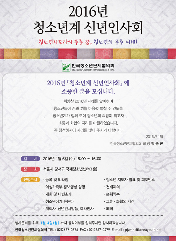 2016년 청소년계 신년인사회 참석 안내 페이지 정보 작성자 관리자 작성일2015.12.28 조회15,107회 댓글0건 첨부파일 붙임2_참석자_명단_통보양식-151230.hwp (12.0K) 207회 다운로드 본문 댓글목록 등록된 댓글이 없습니다. 이전글 다음글 목록