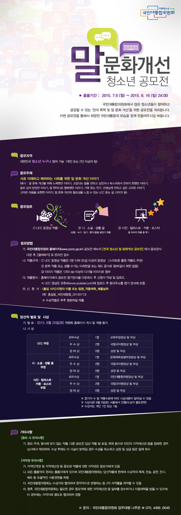 국민대통합위원회에서 많은 청소년들이 참여하고 공감할 수 있는 ‘언어 폭력 및 말 문화 개선’을 위한 공모전을 개최합니다. 이번 공모전을 통해서 희망찬 국민대통합의 모습을 함께 만들어주시길 바랍니다.