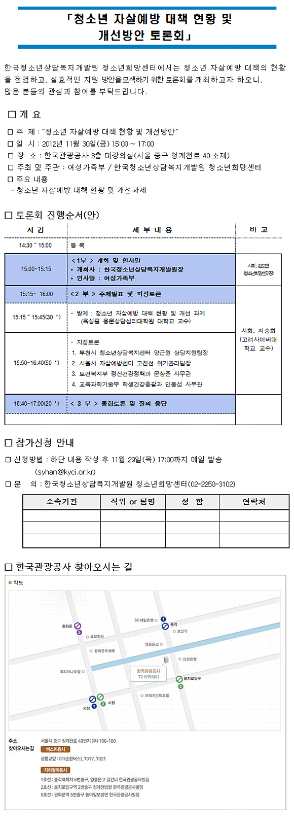 [공지] 청소년 자살예방 대책 현황 및 개선방안 토론회 페이지 정보 작성자 관리자 작성일2012.11.26 조회12,455회 댓글0건 첨부파일 1130_자살예방토론회_안내 및 참가신청.zip (43.1K) 148회 다운로드 본문 댓글목록 등록된 댓글이 없습니다. 이전글 다음글 목록
