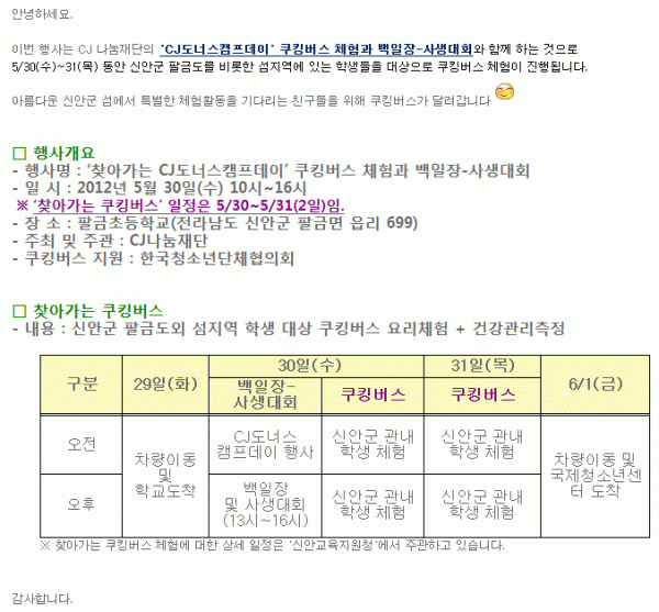 [공지] 찾아가는 쿠킹버스가 전남 신안군 섬으로 갑니다. 페이지 정보 작성자 관리자 작성일2012.05.24 조회12,694회 댓글0건 본문 . 댓글목록 등록된 댓글이 없습니다. 이전글 다음글 목록
