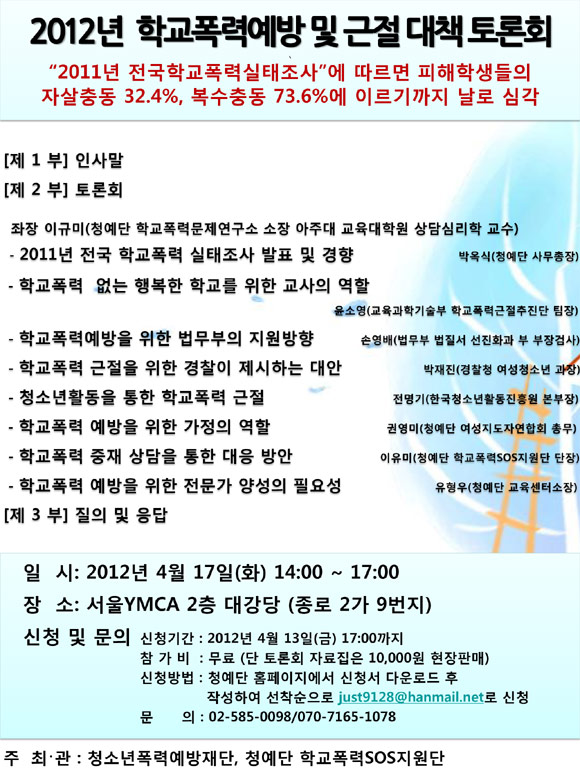 [공지] 2012년 학교폭력예방 및 근절대책토론회 페이지 정보 작성자 관리자 작성일2012.04.05 조회12,529회 댓글0건 본문 댓글목록 등록된 댓글이 없습니다. 이전글 다음글 목록