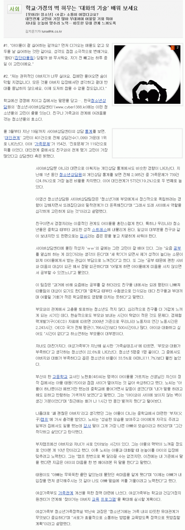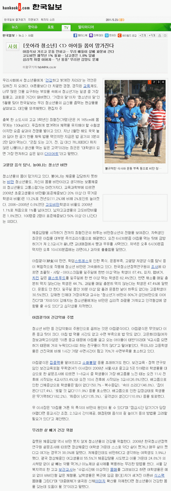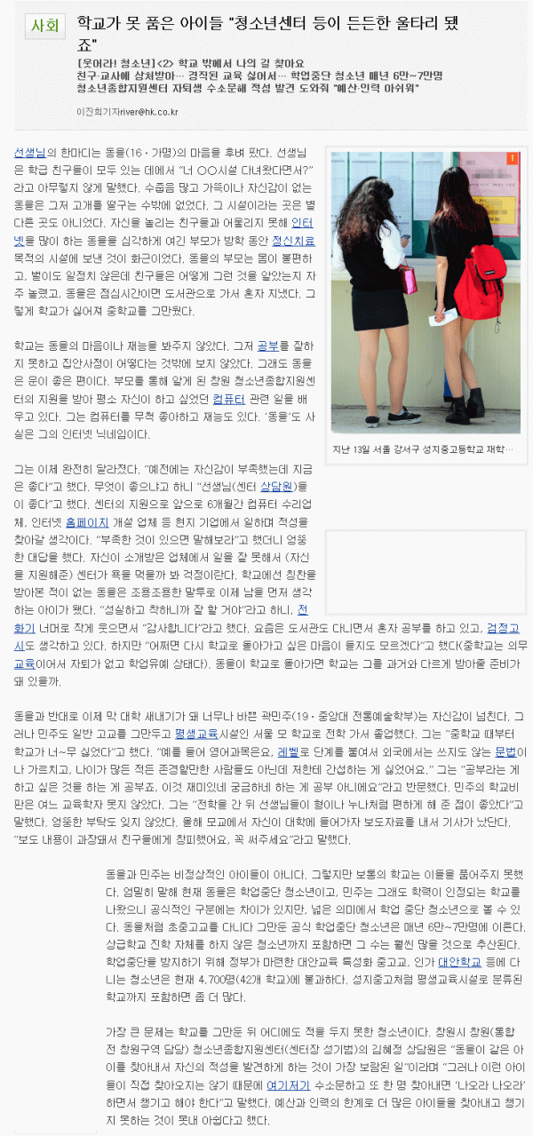 [기획기사] “웃어라! 청소년”(청소년의 신체적ㆍ정신적 건강증진을 위한 사회환경 조성과 관련한 한국일보의 기획기사 입니다) 페이지 정보 작성자 관리자 작성일2011.05.23 조회12,912회 댓글0건 본문 댓글목록 등록된 댓글이 없습니다. 이전글 다음글 목록