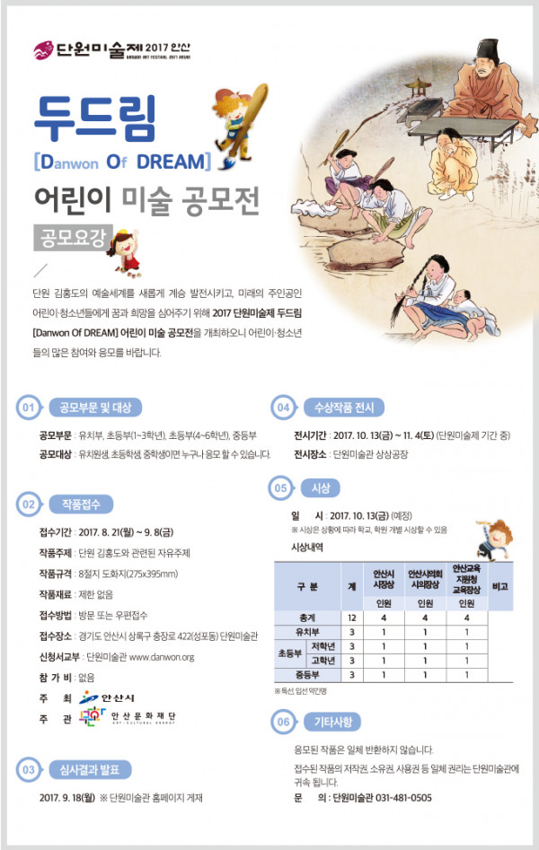 2017단원미술제 두드림[Danwon Of DREAM] 어린이 미술 공모전 공모요강 페이지 정보 작성자 허윤지 작성일2017.08.01 조회11,120회 댓글0건 본문 댓글목록 등록된 댓글이 없습니다. 이전글 다음글 목록