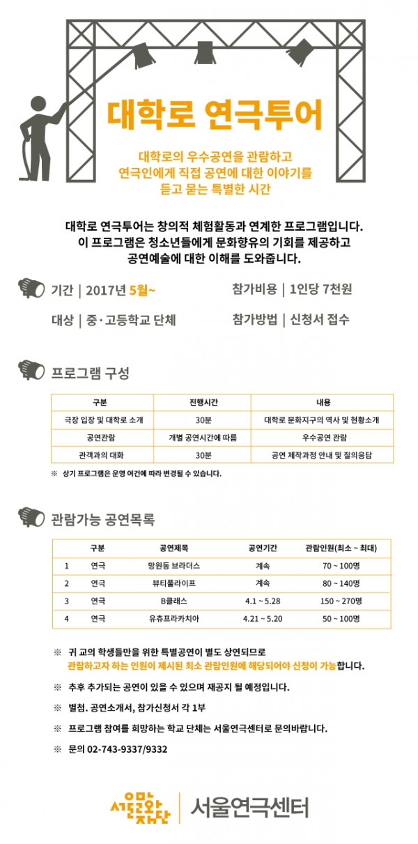 <청소년체험프로그램> 대학로연극투어 참가자 모집 안내 페이지 정보 작성자 서울연극센터 작성일2017.05.19 조회11,396회 댓글0건 본문 댓글목록 등록된 댓글이 없습니다. 이전글 다음글 목록
