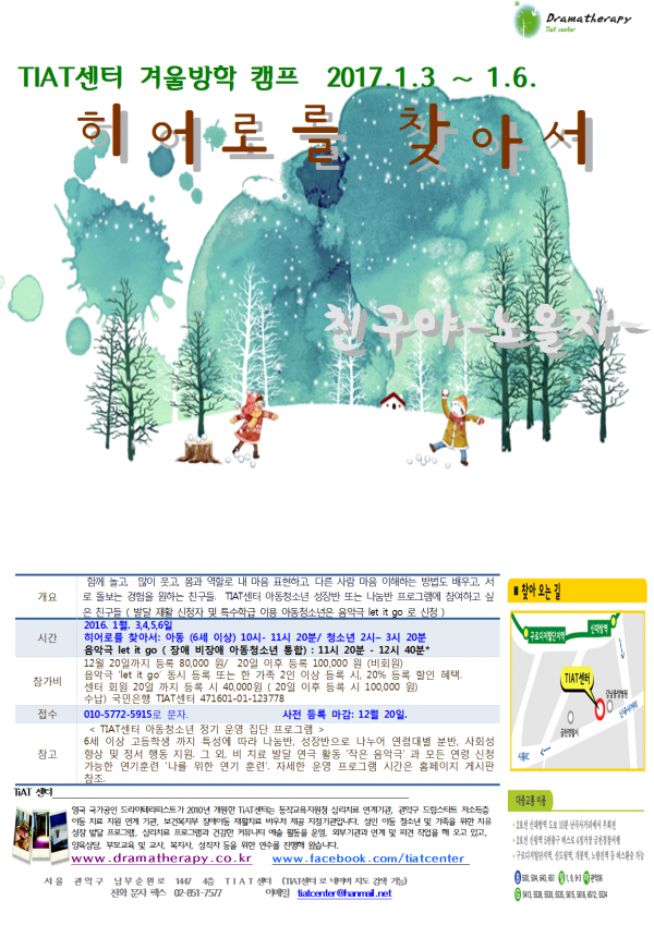 함께 놀고, 많이 웃고, 몸과 역할로 내 마음 표현하고, 다른 사람 마음 이해하는 방법도 배우고, 서로 돌보는 경험을 원하는 친구들. TIAT센터 아동청소년 성장반 또는 나눔반 프로그램에 참여하고 싶은 친구들 ( 발달 재활 신청자 및 특수학급 이용 아동청소년은 음악극 let it go 로 신청 )