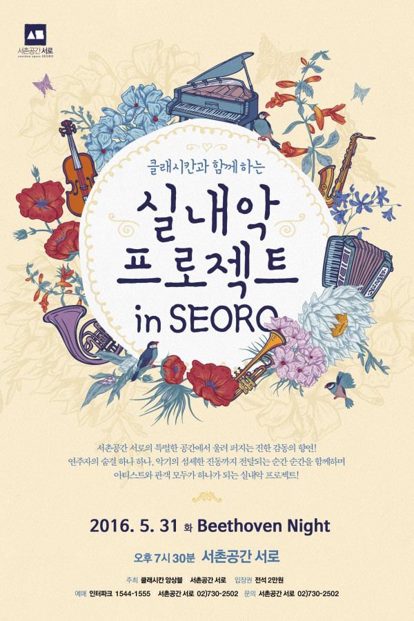 ‘클래시칸과 함께 하는 실내악 프로젝트 in SEORO’ - <BEETHOVEN NIGHT >는 오는 5월 31일(화) 오후 7시30분에 서촌공간 서로에서 열리며, 전석 2만원에 인터파크 티켓(1544-1555) 또는 서촌공간 서로(02-730-2502)에서 예매할 수 있다. 공연문의) 02-730-2502