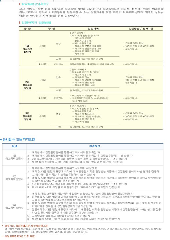 : 학교폭력상담사 2,3급 각 20,000원 / 학교폭력예방교육사2급 각20,000원, 3급 25,000원 /