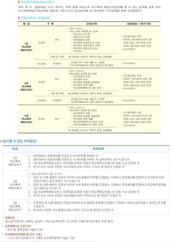 - 학교폭력상담사2급 / 학교폭력예방교육사 2급만 해당(3급 및 미디어과정은 온라인 연수만 진행됨)