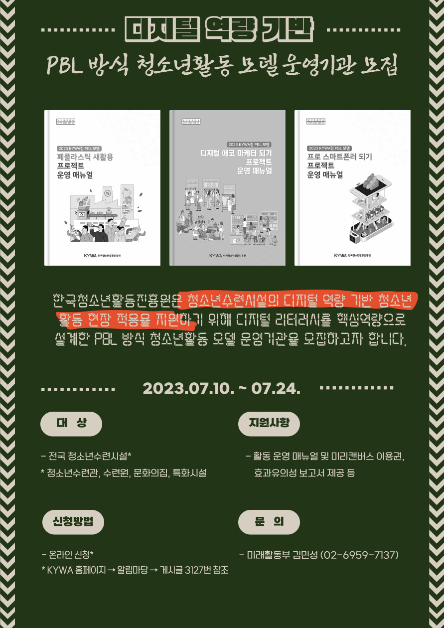 [한국청소년활동진흥원] 디지털 역량 기반 청소년활동 모델 운영기관 모집 페이지 정보 작성자 관리자 작성일2023.07.12 조회6,258회 댓글0건 첨부파일 붙임1.2023년 디지털 역량 기반 청소년활동 모델 운영기관 모집 안내문.hwp (483.5K) 169회 다운로드 본문 댓글목록 등록된 댓글이 없습니다. 이전글 다음글 목록