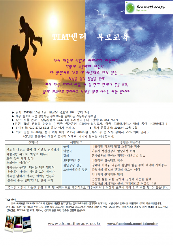 TIAT센터 부모교육 프로그램 이용자 모집안내 페이지 정보 작성자 이경민 작성일2015.09.16 조회9,885회 댓글0건 본문 홈페이지 http://www.dramatherapy.co.kr/ 페이스북 https://www.facebook.com/tiatcenter 댓글목록 등록된 댓글이 없습니다. 이전글 다음글 목록