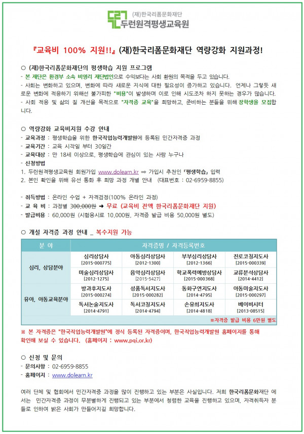 『교육비 100% 지원!!』(재)한국리폼문화재단 역량강화 지원과정!