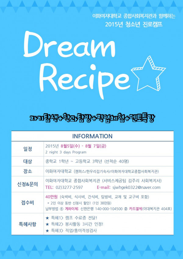 [모집] 이화여자대학교 종합사회복지관과 함께하는 2015년 청소년 진로캠프 "Dream Recipe"