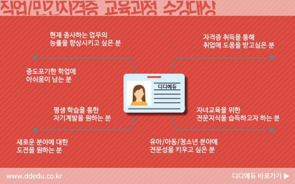 저희 (주)디디에듀에서는 장학지원으로 교육비 전액을 지원하고 있으며, 제공되는 모든 자격증과정은 자격기본법에 의해 국가기관인 한국직업능력개발원에 공식등록 되어 있습니다.
