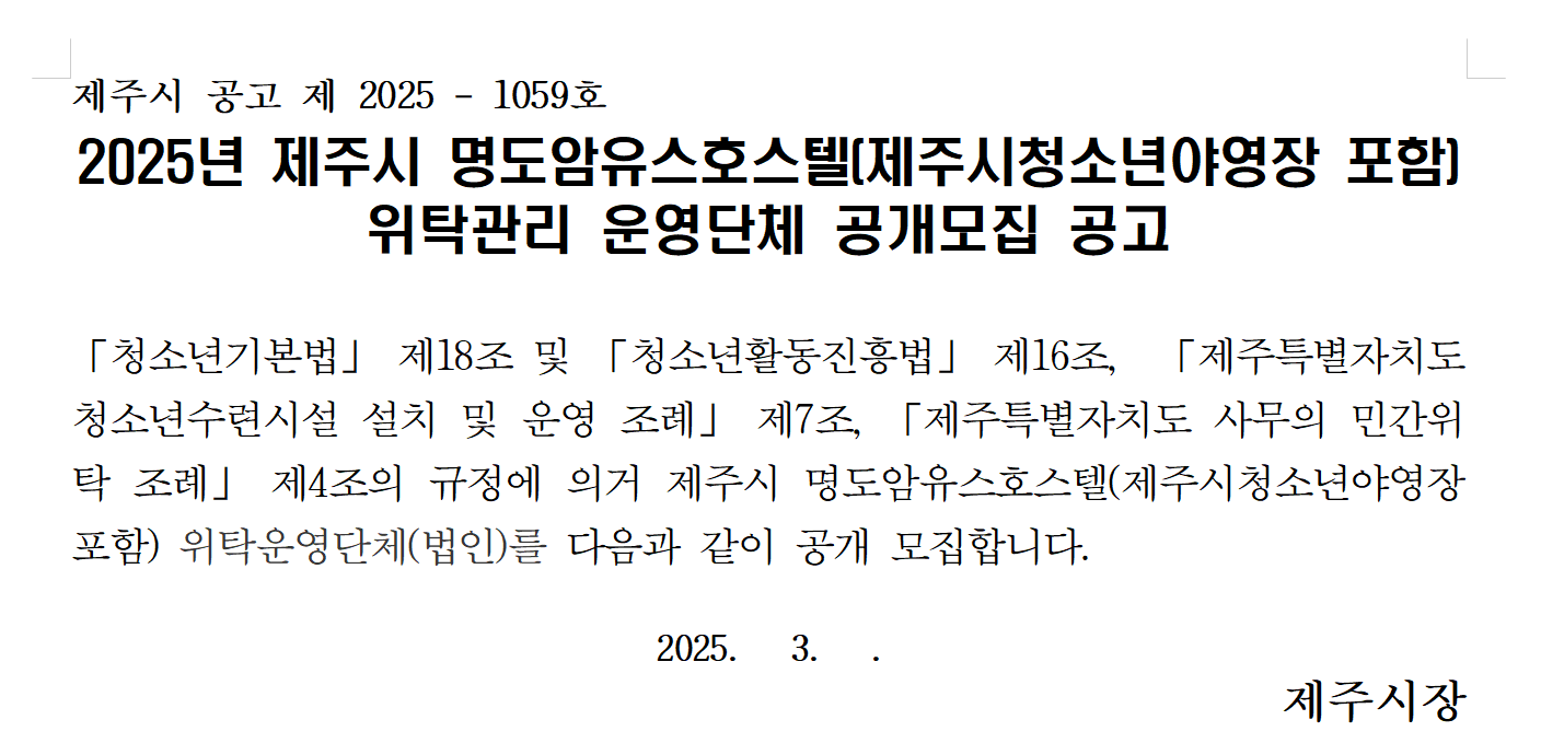 [제주시] 2025년 제주시 명도암유스호스텔(제주시청소년야영장 포함) 위탁관리 운영단체 공개모집 공고