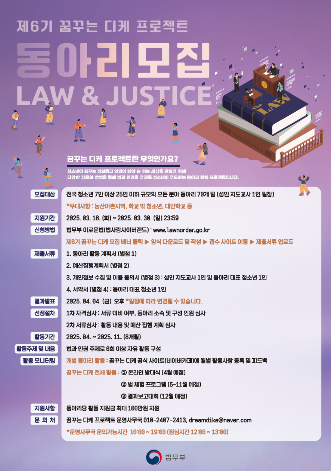 [법무부] 제6기 꿈꾸는 디케 프로젝트 동아리 모집 안내 페이지 정보 작성자 관리자 작성일2025.03.19 조회3,374회 댓글0건 본문 댓글목록 등록된 댓글이 없습니다. 이전글 다음글 목록
