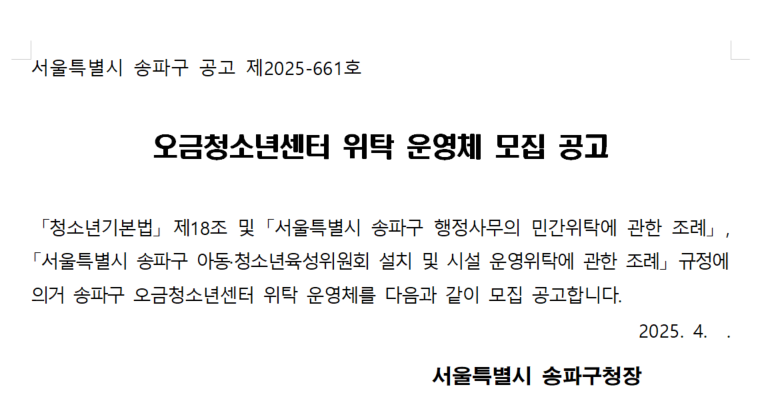 [송파구청] 오금청소년센터 위탁 운영체 모집 공고