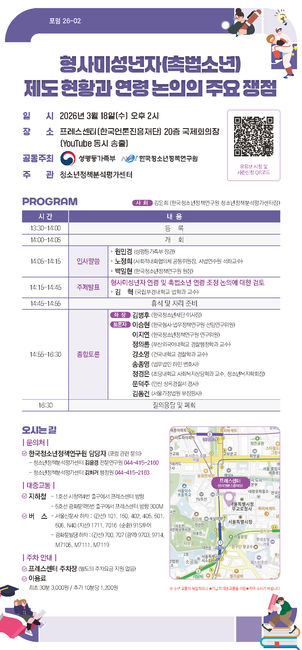 [한국청소년정책연구원] '형사미성년자(촉법소년) 제도 현황과 연령 논의의 주요 쟁점' 포럼 개최 안내 페이지 정보 작성자 관리자 작성일2026.03.17 조회24회 댓글0건 본문 댓글목록 등록된 댓글이 없습니다. 다음글 목록
