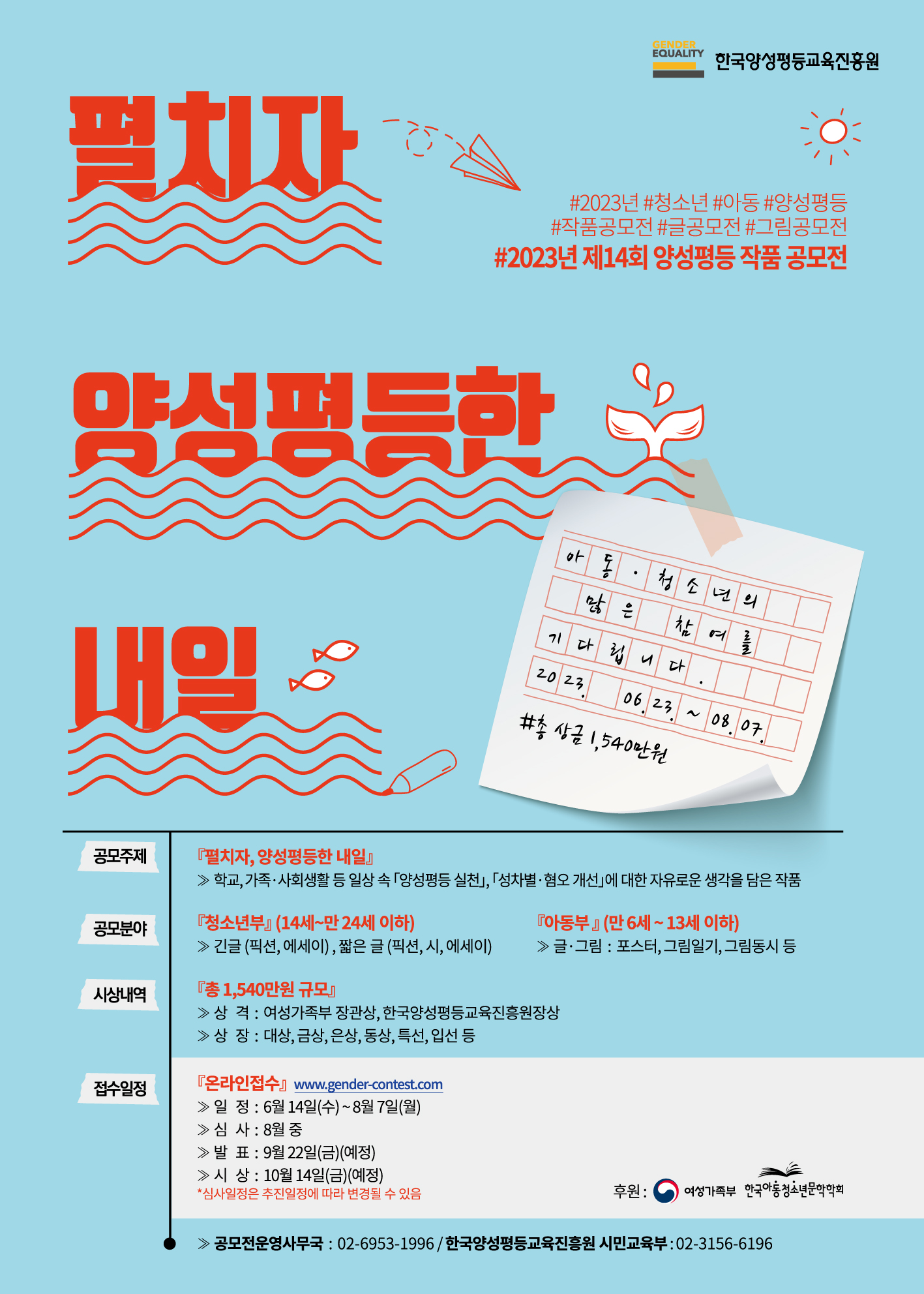[한국양성평등교육진흥원] 제14회 양성평등 작품 공모전 개최 안내 페이지 정보 작성자 관리자 작성일2023.06.28 조회3,102회 댓글0건 본문 댓글목록 등록된 댓글이 없습니다. 이전글 다음글 목록