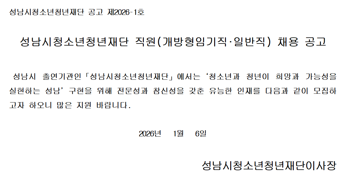 [성남시청소년청년재단] 성남시청소년청년재단 직원(개방형임기직∙일반직) 채용 공고