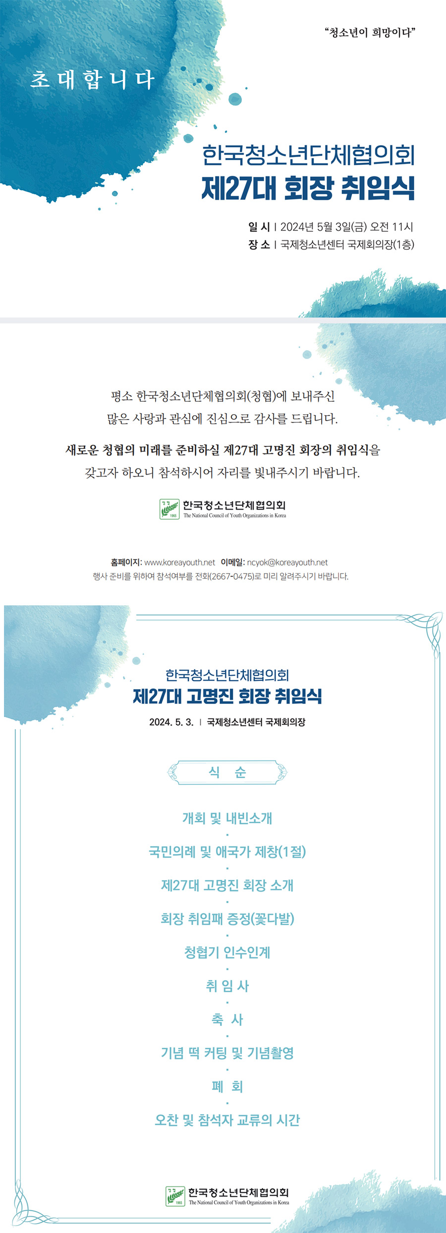 ♠ 청협 제27대 고명진 회장 취임식 개최(5. 3금, 11시) ♠ 페이지 정보 작성자 관리자 작성일2024.04.30 조회181,294회 댓글0건 본문 댓글목록 등록된 댓글이 없습니다. 이전글 다음글 목록