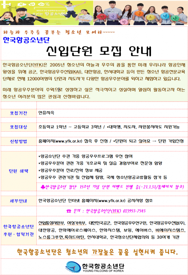 한국항공소년단 신입단원 모집 안내 페이지 정보 작성자 관리자 작성일2020.12.22 조회69,383회 댓글0건 본문 * 많은 관심과 참여를 부탁드립니다. 댓글목록 등록된 댓글이 없습니다. 이전글 다음글 목록
