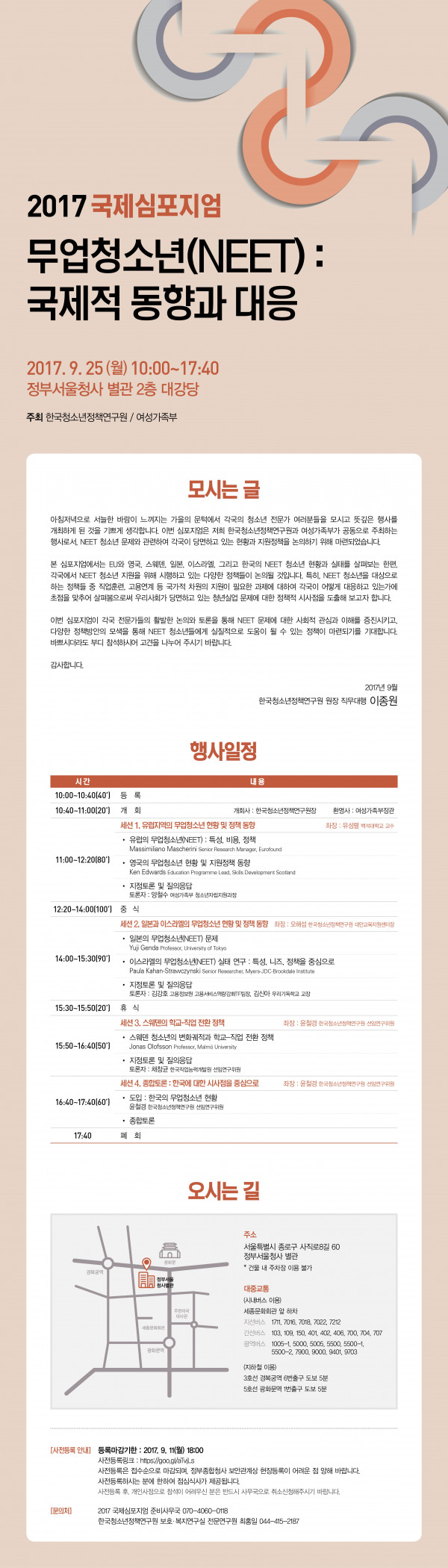 - 행사명 : 2017 국제심포지엄 [무업청소년(NEET): 국제적 동향과 대응]