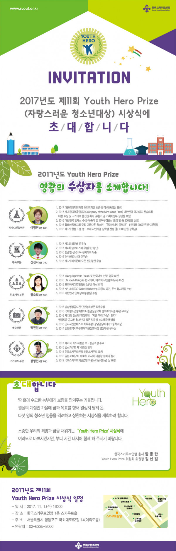 2017년도 제11회 Youth Hero Prize 시상식 초대 페이지 정보 작성자 관리자 작성일2017.10.12 조회19,841회 댓글0건 본문 2017년도 제11회 Youth Hero Prize 시상식 초대(행사 홈페이지 바로가기) 댓글목록 등록된 댓글이 없습니다. 이전글 다음글 목록