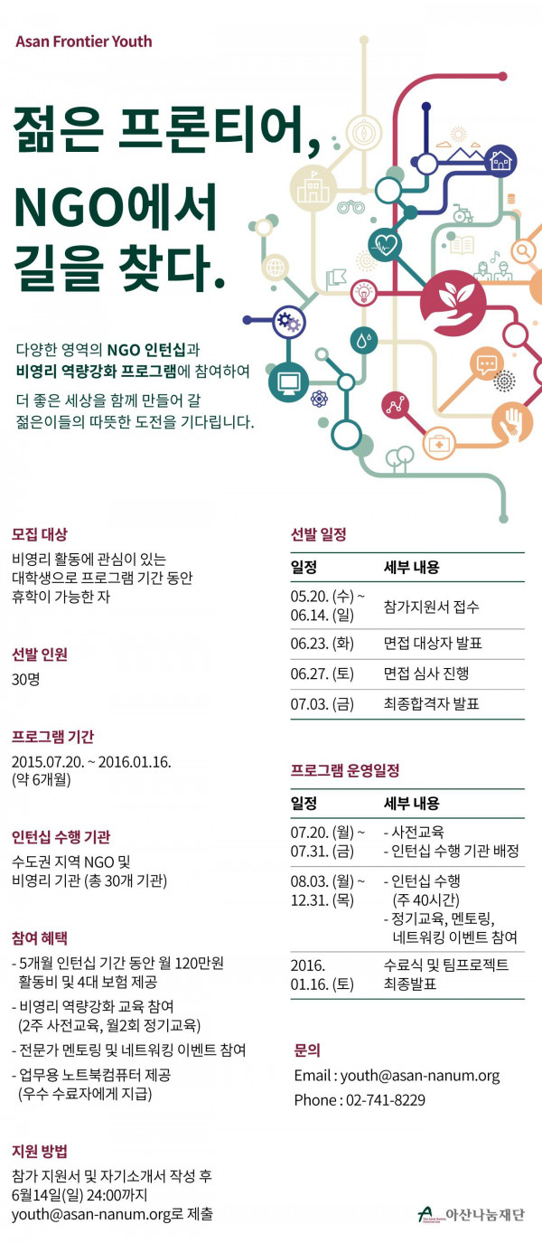 아산나눔재단 제1기 아산 프론티어 유스 참가자 모집(대학생 NGO 인턴십) 페이지 정보 작성자 관리자 작성일2015.05.22 조회17,726회 댓글0건 본문 * 공모 홈페이지 바로가기 ! 댓글목록 등록된 댓글이 없습니다. 이전글 다음글 목록