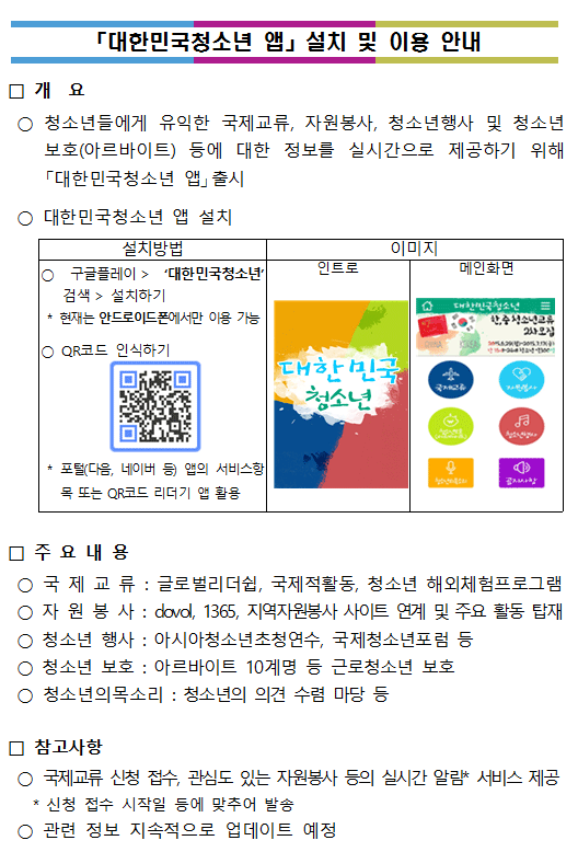 대한민국청소년 앱 설치 및 이용 안내(여성가족부) 페이지 정보 작성자 관리자 작성일2015.06.02 조회22,562회 댓글0건 본문 .. 댓글목록 등록된 댓글이 없습니다. 이전글 다음글 목록