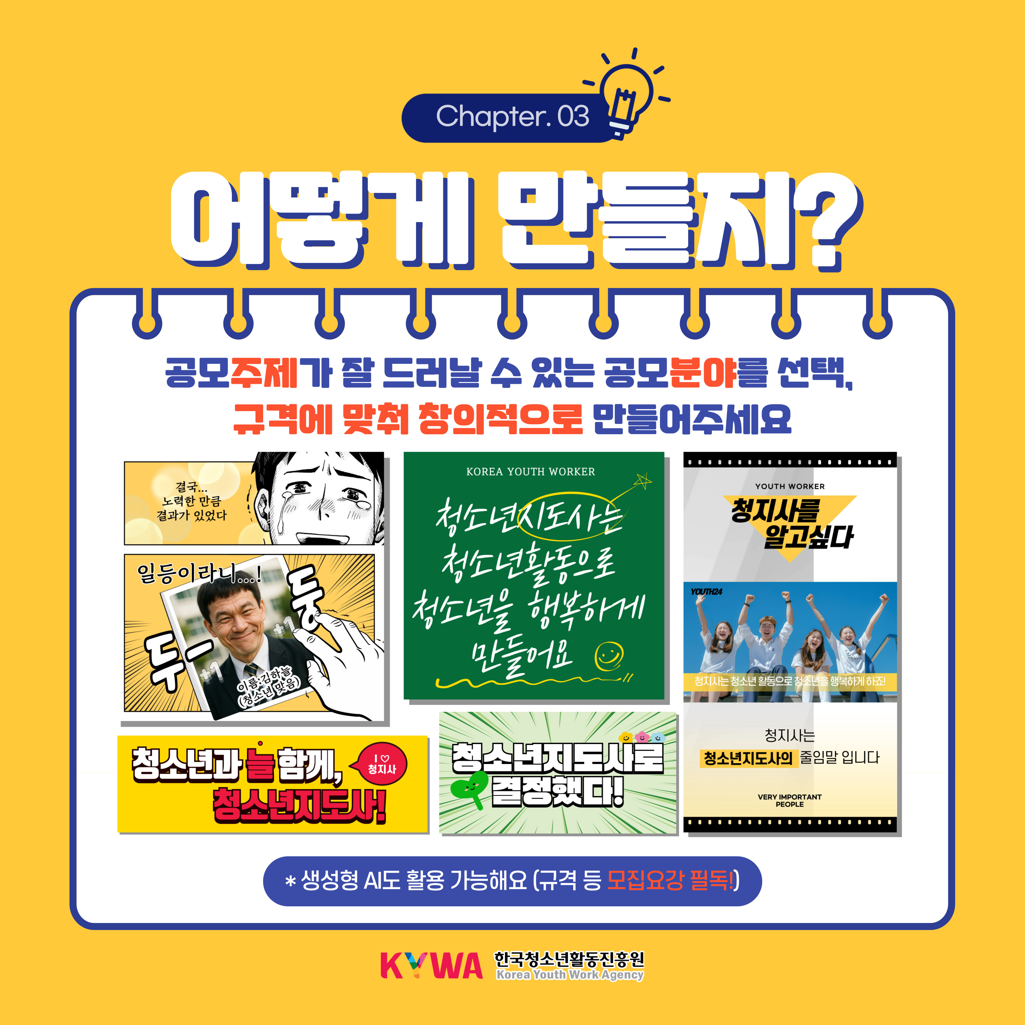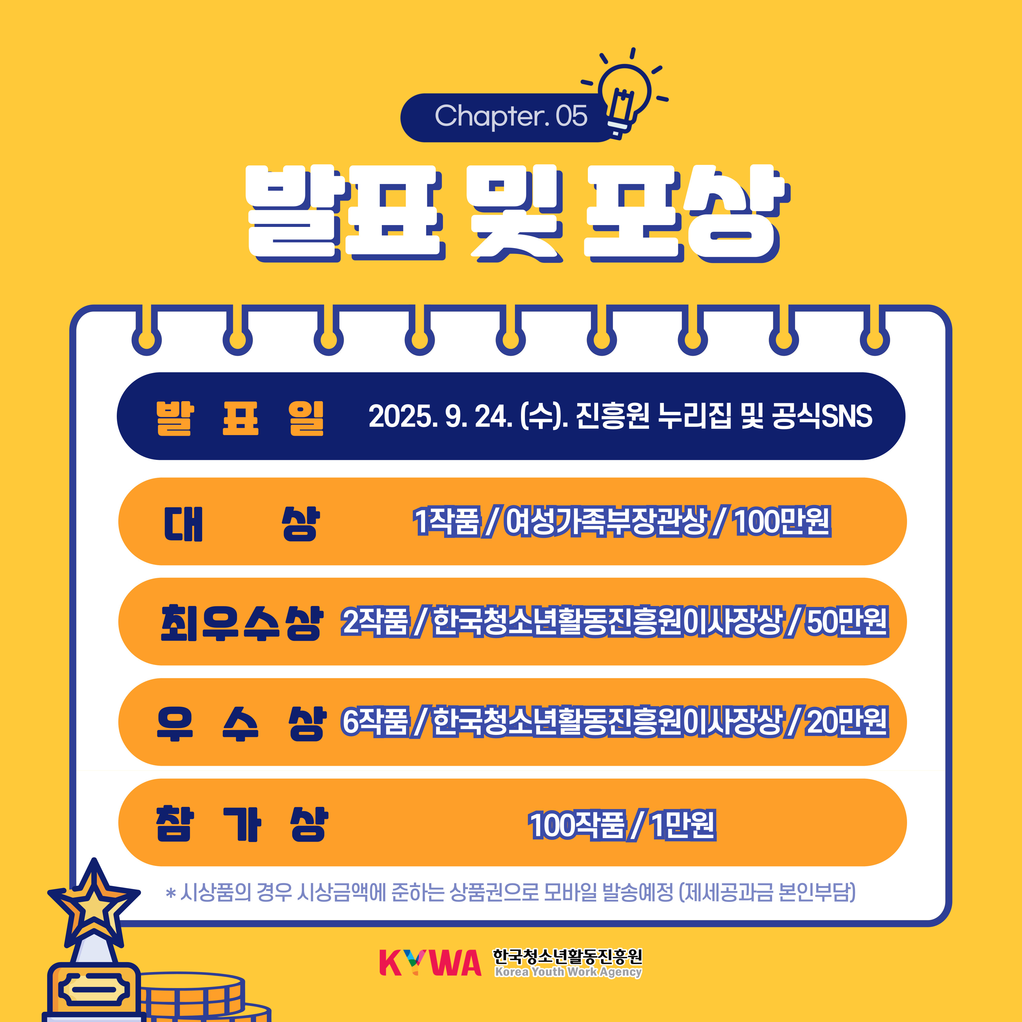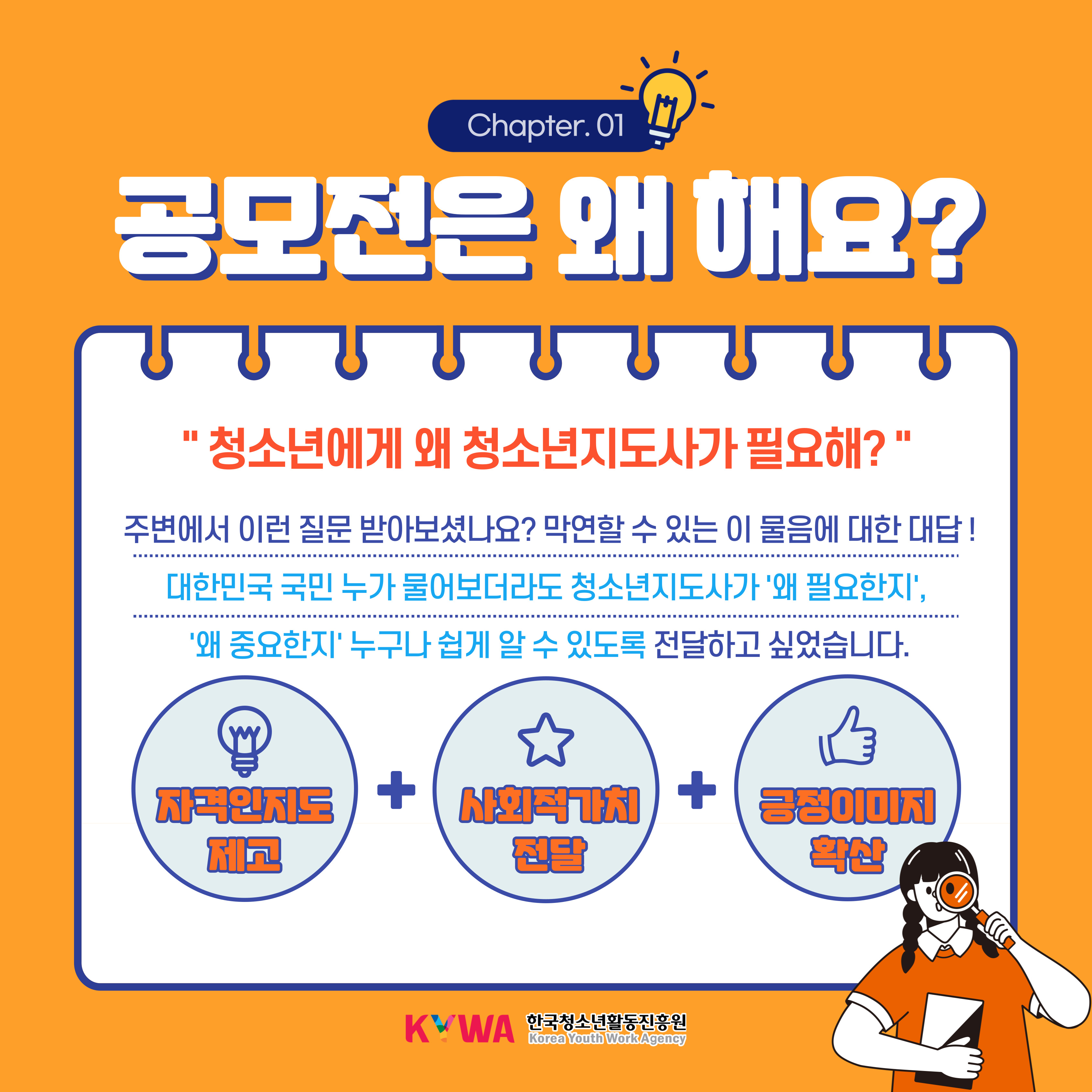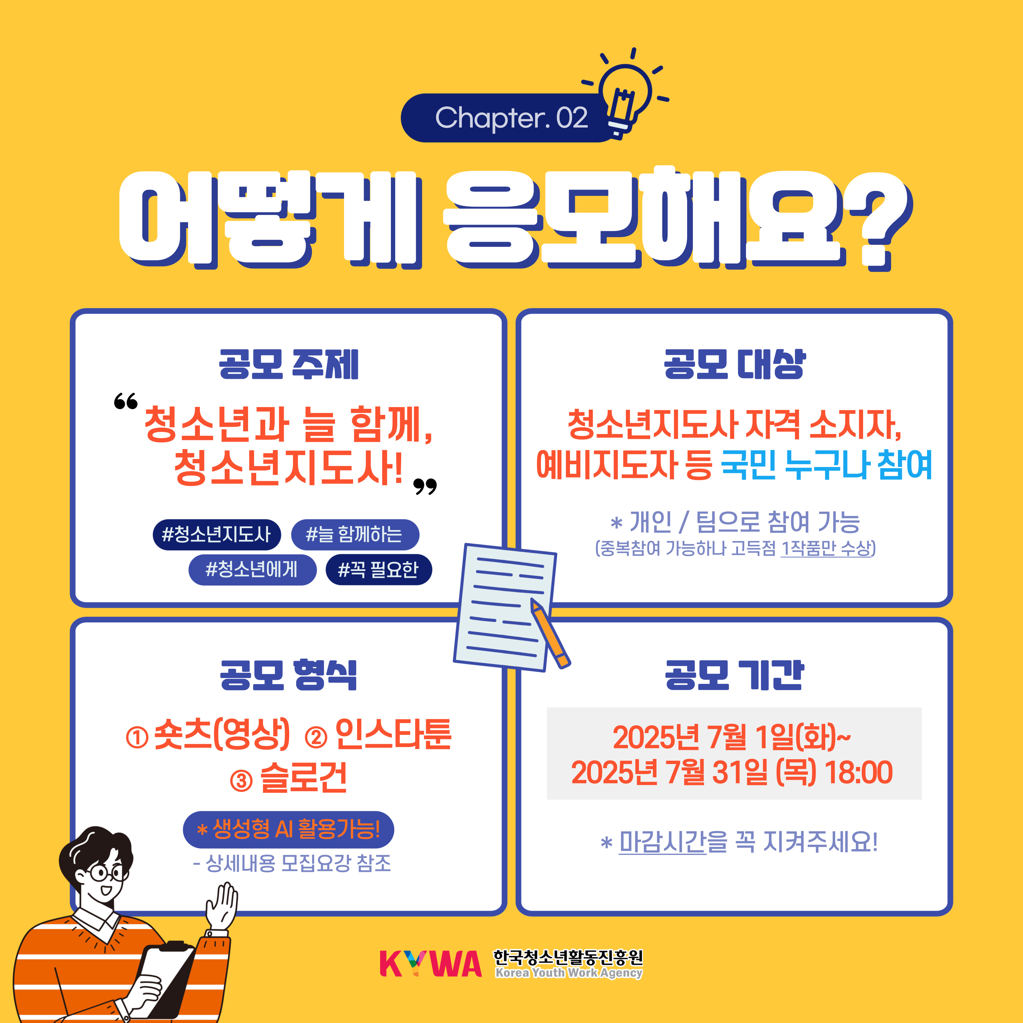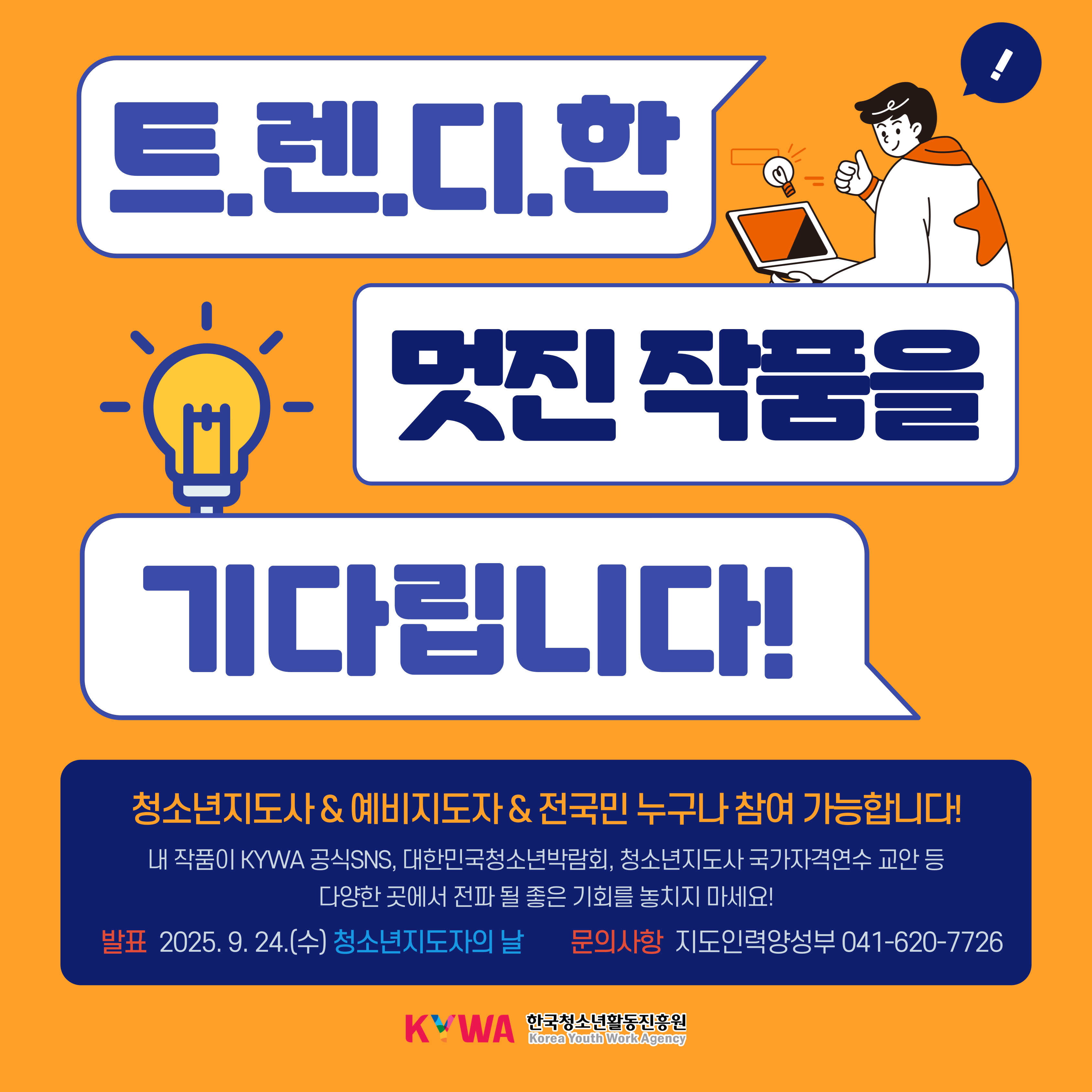 [한국청소년활동진흥원] '2025년 청소년지도사 국민홍보 콘텐츠 공모전' 개최 안내 페이지 정보 작성자 관리자 작성일2025.06.27 조회3,336회 댓글0건 첨부파일 붙임1.2025년_청소년지도사_국민홍보_콘텐츠_공모전_모집공고_및_요강.hwpx (94.8K) 67회 다운로드 청소년지도사_국민홍보_콘텐츠_공모전_웹포스터.png (296.3K) 105회 다운로드 본문 댓글목록 등록된 댓글이 없습니다. 이전글 다음글 목록