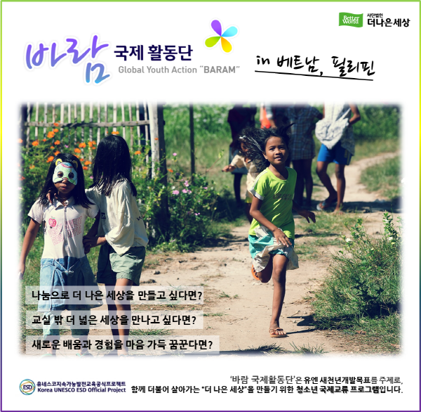 [더나은세상] 청소년을 위한 지구마을학교, 『바람 국제활동단』 모집합니다! 페이지 정보 작성자 더나은세상 작성일2013.05.02 조회10,774회 댓글0건 본문 댓글목록 등록된 댓글이 없습니다. 이전글 다음글 목록