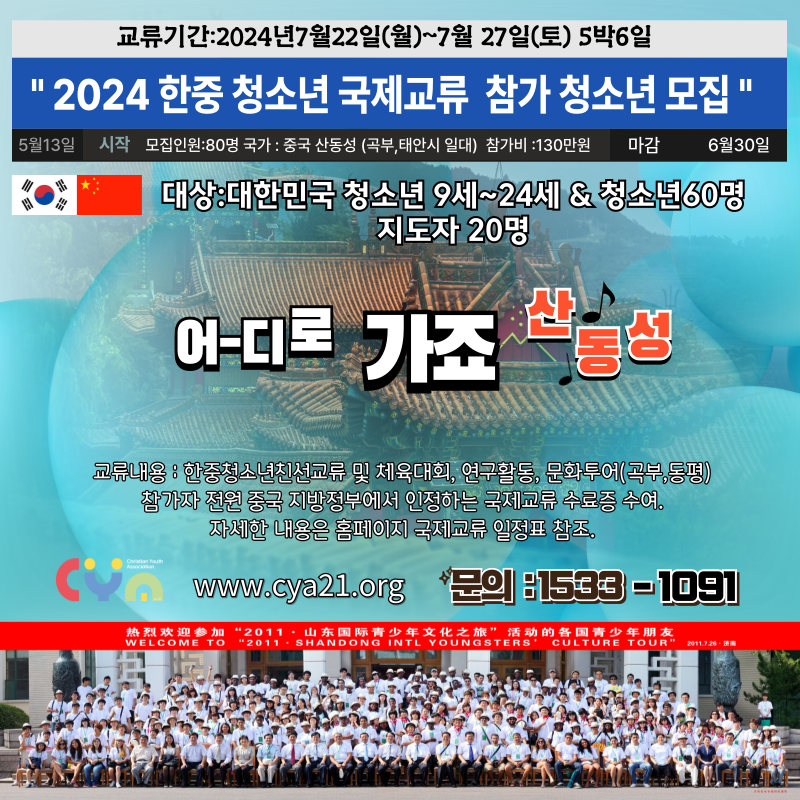 [CYA] 2024 한중 청소년 국제교류 참가 청소년 모집 페이지 정보 작성자 관리자 작성일2024.05.28 조회2,281회 댓글0건 첨부파일 51-2 2024한중청소년교류 일정표 및 참가자 모집 일정표.pdf (830.1K) 97회 다운로드 본문 * 보다 자세한 내용은 붙임 '모집 일정표'를 통해 확인 바랍니다. 댓글목록 등록된 댓글이 없습니다. 이전글 다음글 목록