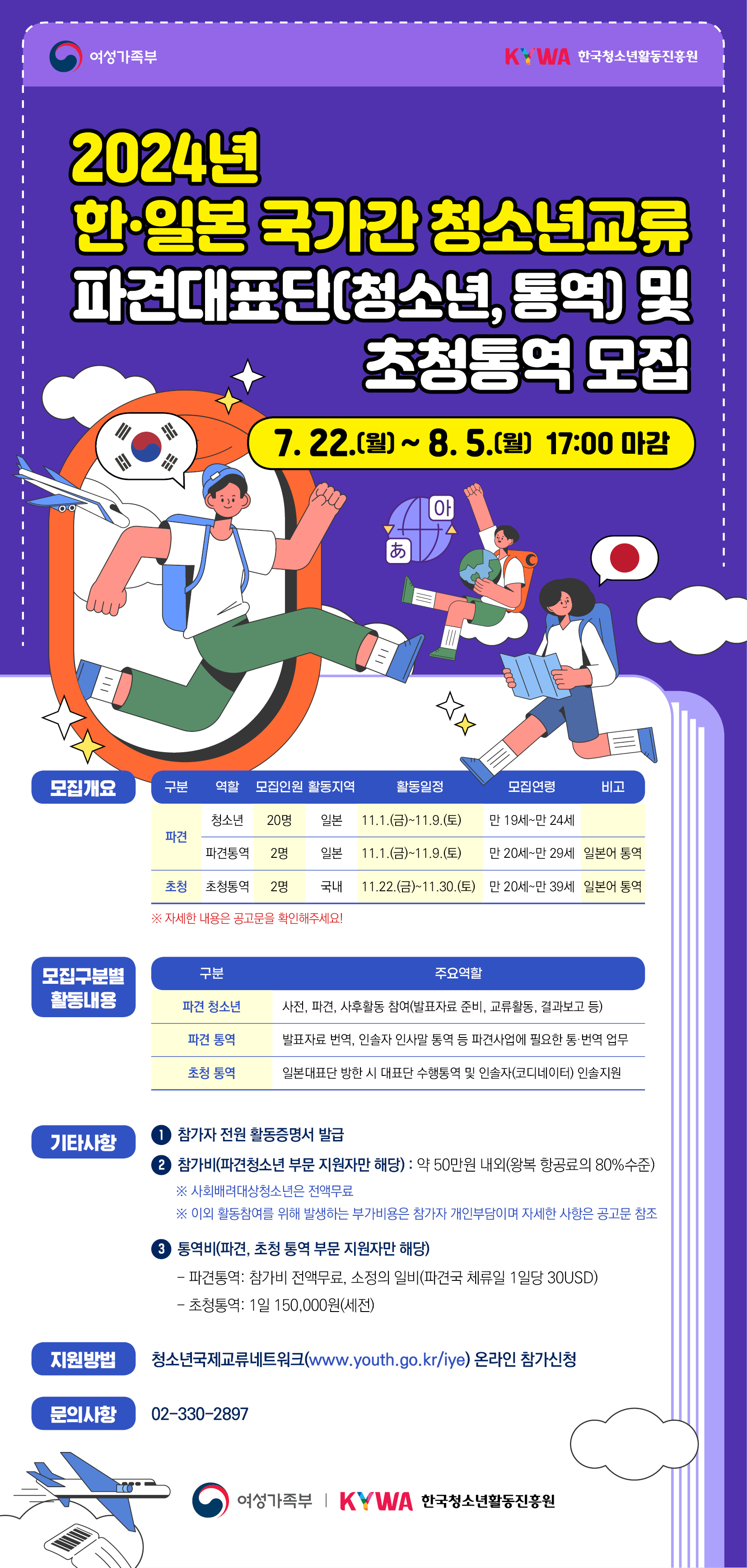 [한국청소년활동진흥원] 2024년 한·일 국가간 청소년교류 파견대표단(청소년, 통역) 및 초청수행통역 모집