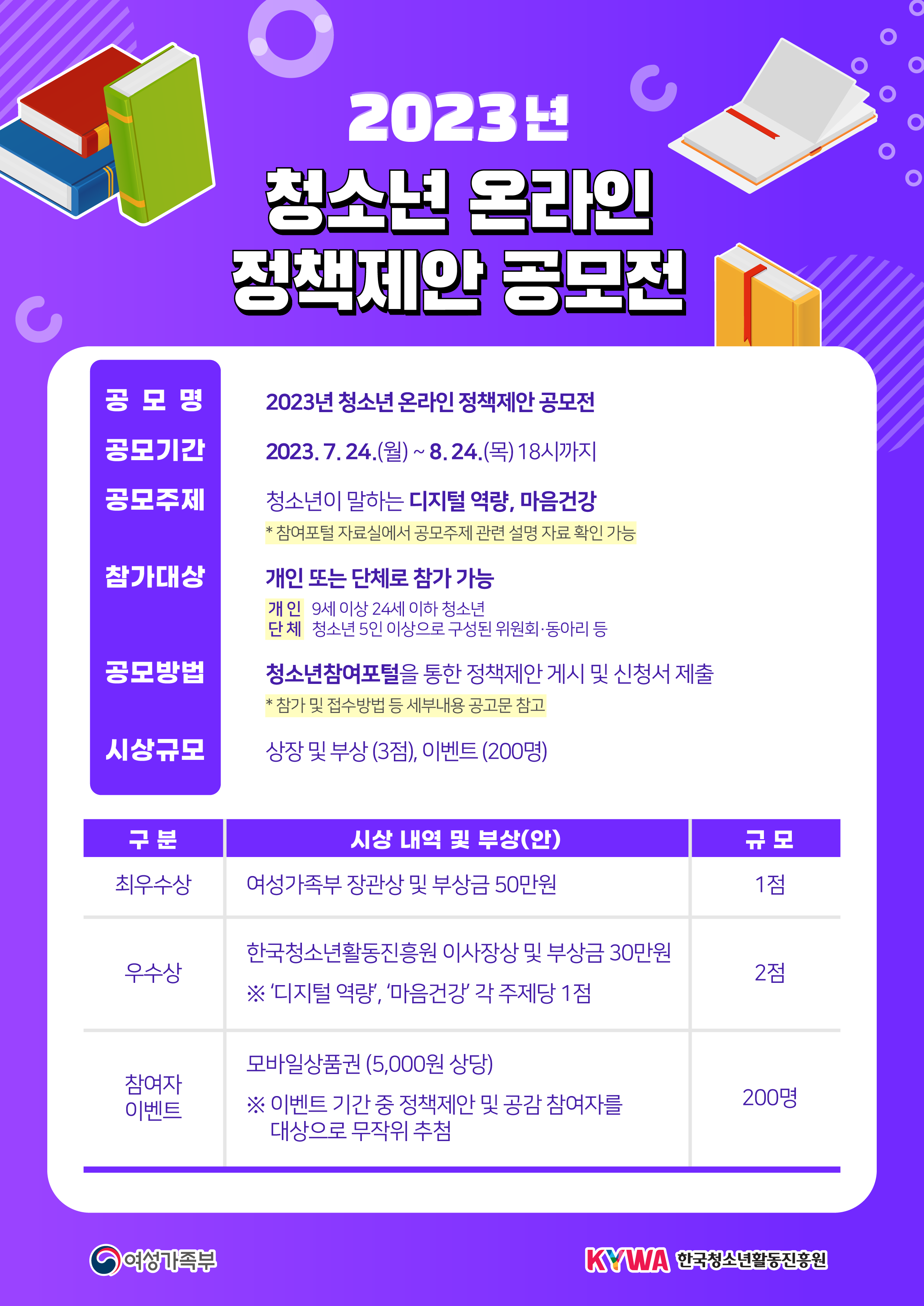 [한국청소년활동진흥원] 2023년 청소년 온라인 정책제안 공모전 페이지 정보 작성자 관리자 작성일2023.07.31 조회2,818회 댓글0건 첨부파일 붙임1. 2023년 청소년 온라인 정책제안 공모전 공고문.hwpx (3.3M) 92회 다운로드 본문 *자세한 사항은 붙임파일을 참고하시기 바랍니다. 댓글목록 등록된 댓글이 없습니다. 이전글 다음글 목록