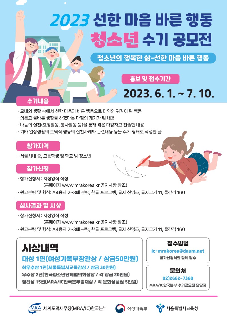 세계도덕재무장(MRA/IC)한국본부는 코로나-19의 어려운 상황을 극복한 청소년들이 선한 마음과 바른 행동의 실천 활동으로 타인과의 원만한 관계 속에 공동체의 행복한 삶을 살게 하여 성숙한 민주시민으로 성장토록 하고자 ‘2023 선한 마음 바른 행동 청소년 수기 공모전’을 개최합니다. 학부모, 교사, 여러분의 많은 관심과 성원 그리고 중·고등학생(청소년)들의 많은 참가를 기대합니다.