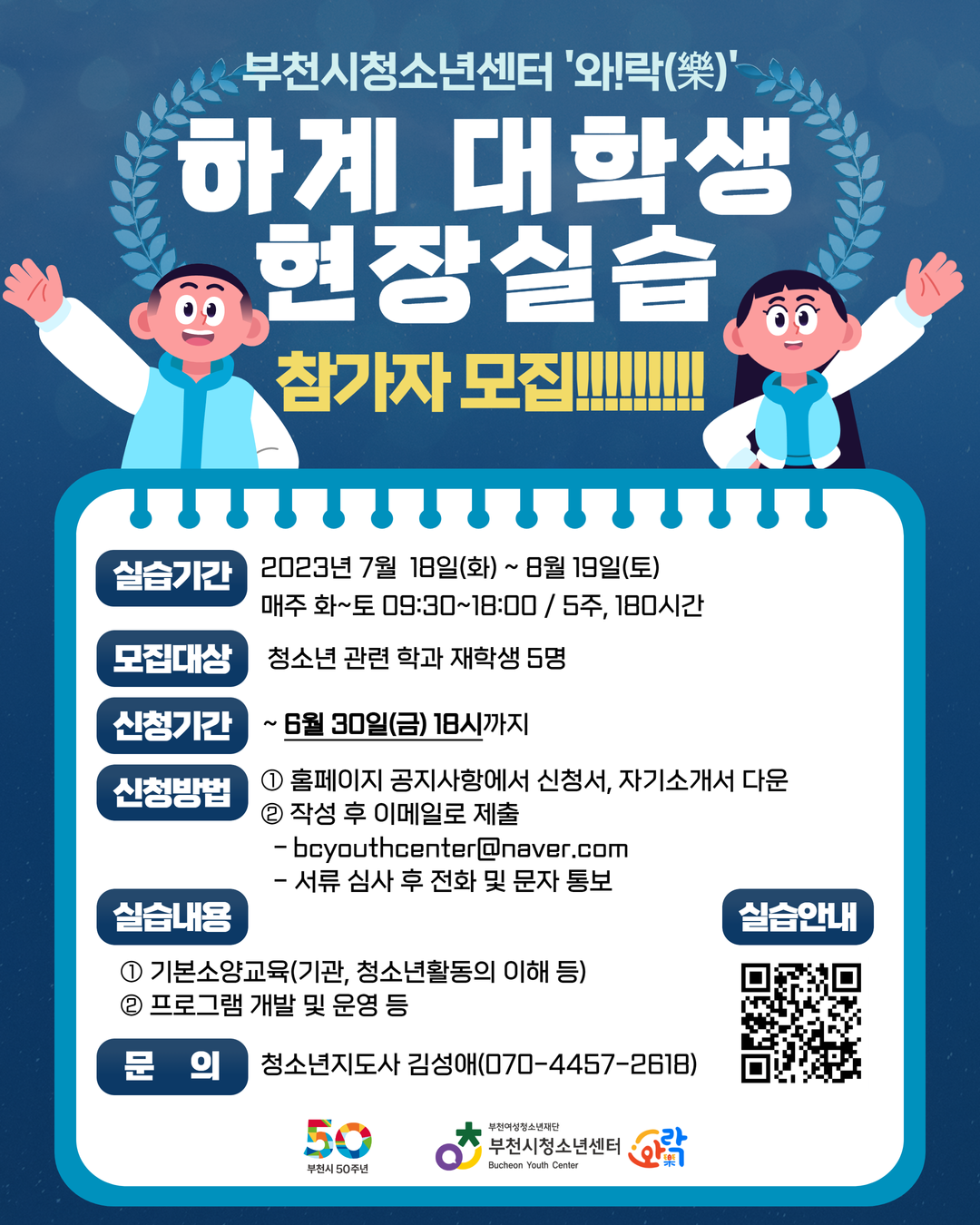 부천시청소년센터 하계 대학생 실습생 모집 안내
