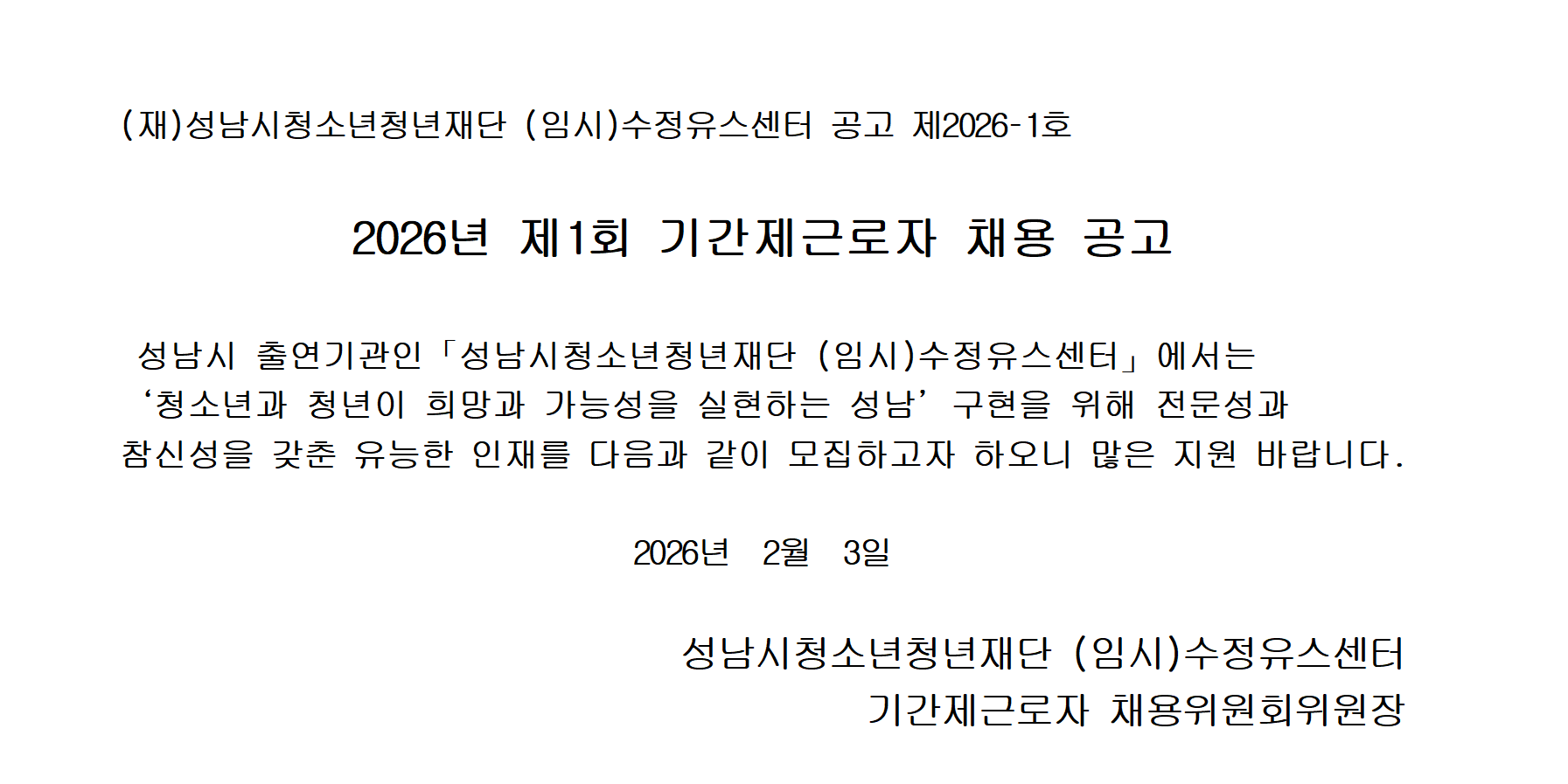 [성남시청소년청년재단] 2026년 제1회 기간제근로자 공개채용 안내 페이지 정보 작성자 관리자 작성일2026.02.02 조회16회 댓글0건 첨부파일 2026년 제1회 기간제근로자 채용 공고 및 응시원서.hwp (137.5K) 1회 다운로드 본문 * 보다 자세한 내용은 붙임 '공고문' 등을 통해 확인하시기 바랍니다. 댓글목록 등록된 댓글이 없습니다. 이전글 다음글 목록